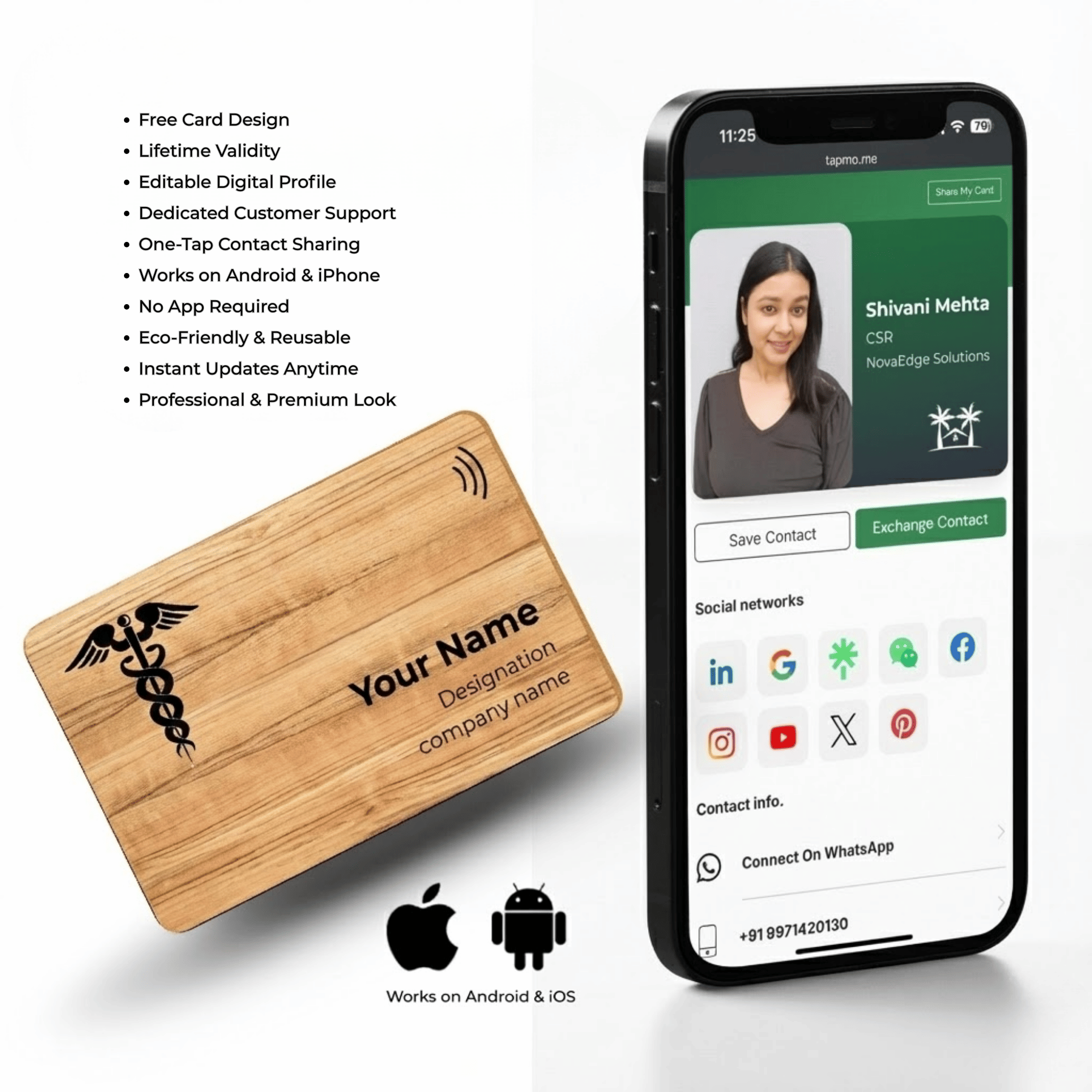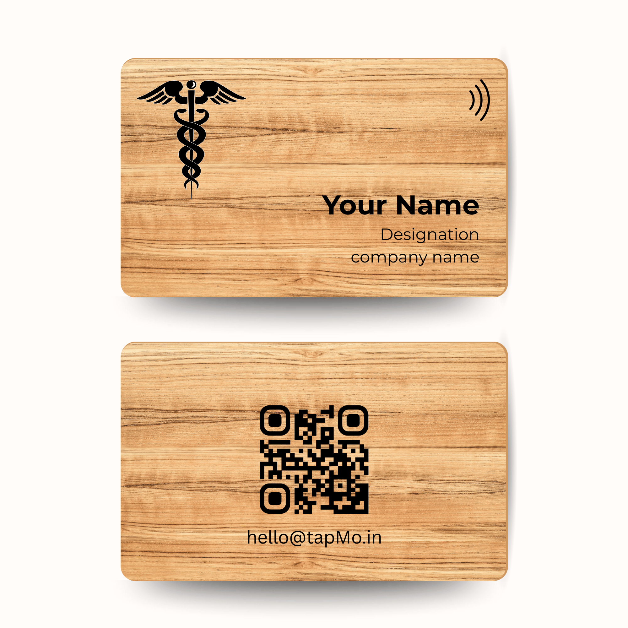 The TapMo Bamboo NFC Card for Doctors is an eco-friendly digital visiting card designed for healthcare professionals who prefer sustainable and elegant solutions. Share clinic details with one tap.