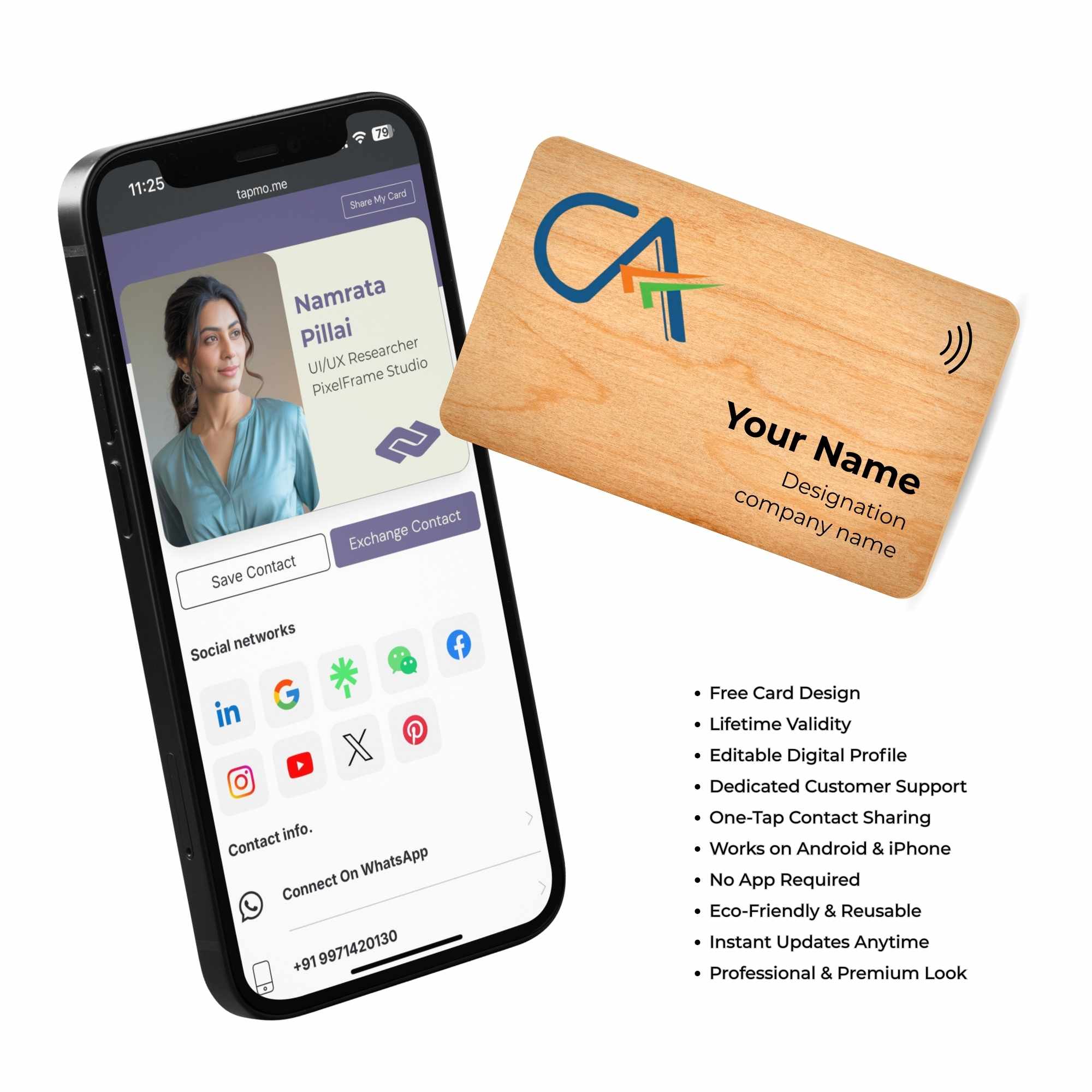 The TapMo Natural Wood NFC Card for Finance Professionals is an eco-friendly digital visiting card designed for finance consultants, Chartered Accountants, auditors, investment advisors, and financial professionals who want a natural, trustworthy, and modern professional identity. Crafted from authentic natural wood and embedded with smart NFC technology, this card enables instant sharing of contact details, office address, services, and professional profiles with just one tap.